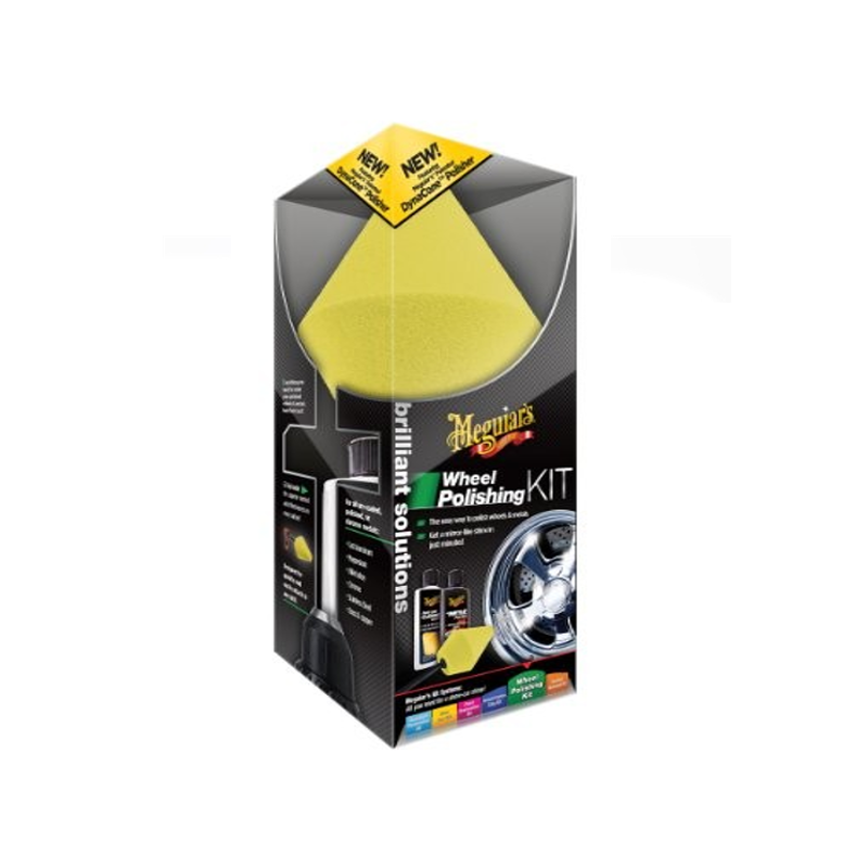 קיט פוליש לחישוקים מסדרת Brilliant Solutions של Meguiar's הכולל פד ייעודי בצורה ייחודית המתחבר למברגה, פוליש מתכת ייעודי לחישוקים (118 מ"ל) וחומר ניקוי הפד (118 מ"ל).